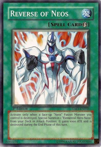 Activate only when a face-up ‘Neos’ Fusion Monster you control is destroyed. Special Summon 1 ‘Elemental Hero Neos’ from your Deck in Attack Position. It gains 1000 ATK and is destroyed during the End Phase of this turn.