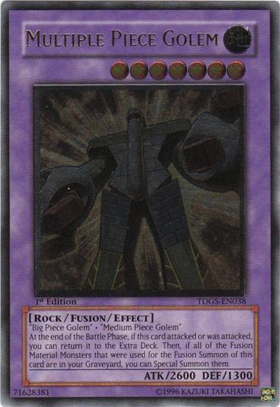 ‘Big Piece Golem’ + ‘Medium Piece Golem’At the end of the Battle Phase, if this card attacked or was attacked, you can return it to the Extra Deck. Then, if all of the Fusion Material Monsters that were used for the Fusion Summon of this card are in your Graveyard, you can Special Summon them.