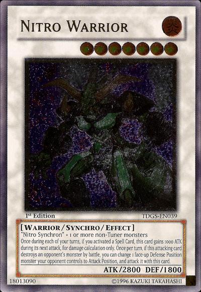‘Nitro Synchron’ + 1 or more non-Tuner monstersOnce during each of your turns, if you activate a Spell Card, this card gains 1000 ATK during the next attack this turn involving this card, during damage calculation only. If this attacking card destroys an opponent’s monster by battle, after damage calculation: You can target 1 face-up Defense Position monster your opponent controls; change that target to Attack Position, then this card can make a second attack in a row, on that monster.