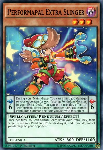 Pendulum EffectDuring your Main Phase: You can inflict 300 damage to your opponent for each face-up Pendulum Monster in your Extra Deck. You can only use this effect of ‘Performapal Extra Slinger’ once per turn. You cannot Pendulum Summon the turn you activate this effect.Monster EffectOnce per turn: You can banish 1 card from your Extra Deck, then target 1 card in a Pendulum Zone; destroy it, and if you do, inflict 300 damage to your opponent.