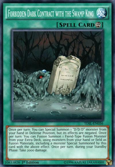 Once per turn: You can Special Summon 1 ‘D/D/D’ monster from your hand in Defense Position, but its effects are negated. Once per turn: You can Fusion Summon 1 Fiend-Type Fusion Monster from your Extra Deck, using monsters from your hand or field as Fusion Materials, including a monster Special Summoned by this card with the above effect. Once per turn, during your Standby Phase: Take 2000 damage.