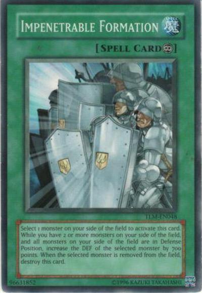 Select 1 monster on your side of the field to activate this card. While you have 2 or more monsters on your side of the field, and all monsters on your side of the field are in Defense Position, the selected monster gains 700 DEF. When the selected monster is removed from the field, destroy this card.