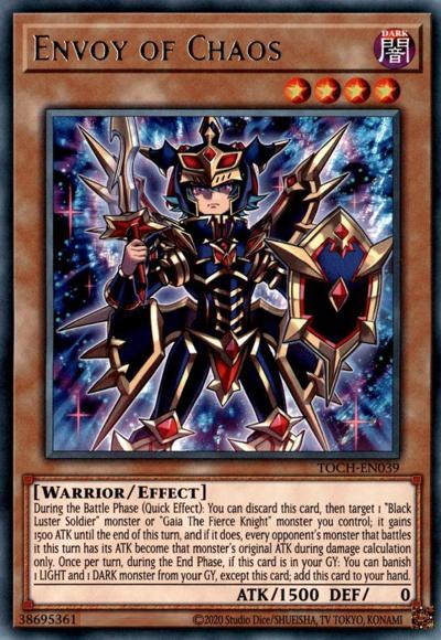 During either player’s Battle Phase: You can discard this card, then target 1 ‘Black Luster Soldier’ monster or ‘Gaia The Fierce Knight’ monster you control; it gains 1500 ATK until the end of this turn, and if it does, every opponent’s monster that battles it this turn has its ATK become that monster’s original ATK during damage calculation only. Once per turn, during the End Phase, if this card is in the Graveyard: You can banish 1 LIGHT and 1 DARK monster from your Graveyard, except this card; add this card to your hand.