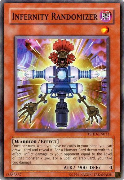 Once per turn, while you have no cards in your hand, you can draw 1 card and reveal it. For a Monster Card drawn with this effect, inflict damage to your opponent equal to the Level of that monster x 200. For a Spell or Trap Card, you take 500 damage.