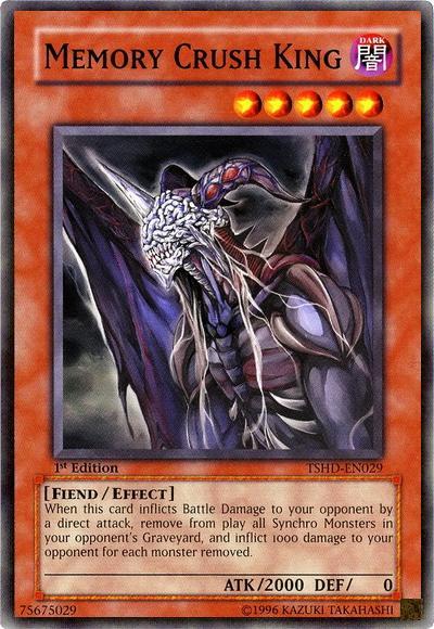 When this card inflicts Battle Damage to your opponent by a direct attack, remove from play all Synchro Monsters in your opponent’s Graveyard, and inflict 1000 damage to your opponent for each monster removed.