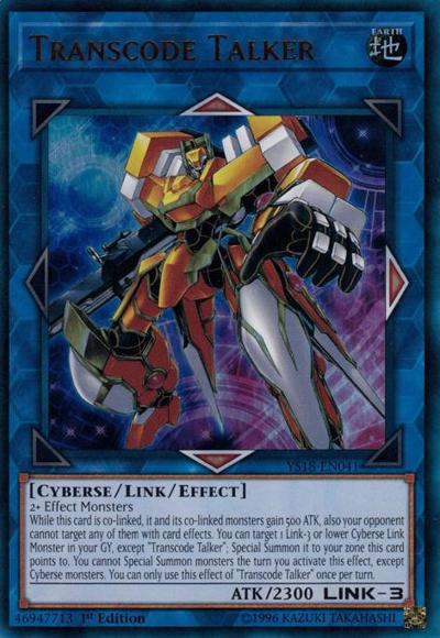 2+ Effect MonstersWhile this card is co-linked, it and its co-linked monsters gain 500 ATK, also your opponent cannot target any of them with card effects. You can target 1 Link-3 or lower Cyberse Link Monster in your GY, except ‘Transcode Talker’; Special Summon it to your zone this card points to. You cannot Special Summon monsters the turn you activate this effect, except Cyberse monsters. You can only use this effect of ‘Transcode Talker’ once per turn.